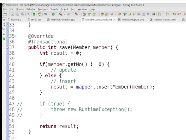 - 커밋롤백 처리하기 위해서 트랜젝션 설정한다.