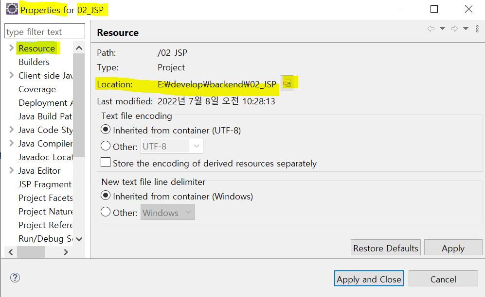 해당 프로젝트 우클릭 → Properties → Resource → Location 우측 아이콘 선택