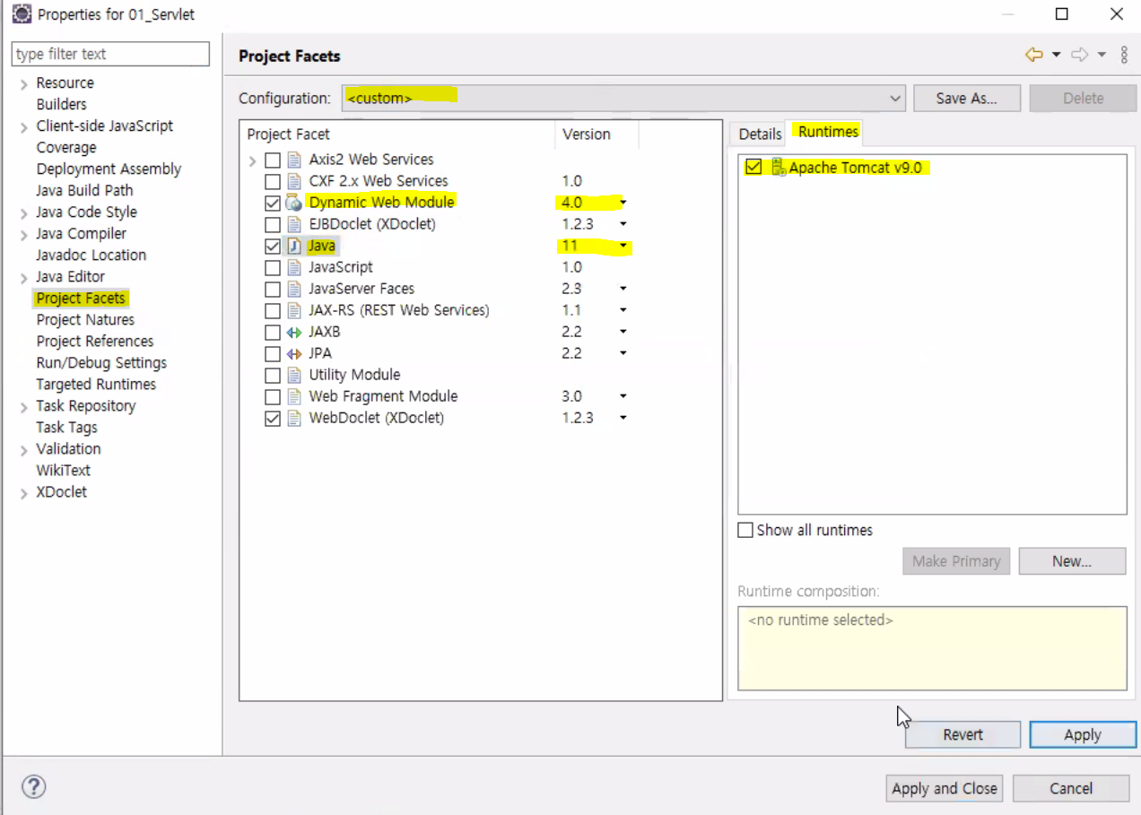 → Runtimes : 톰켓 9.0으로 설정