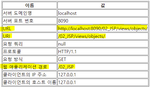 - URL : http (프로토콜) ://localhost (도메인, IP):8090 (서버의 포트번호)/02_JSP(contextRoot)/views/objects/ (URI)