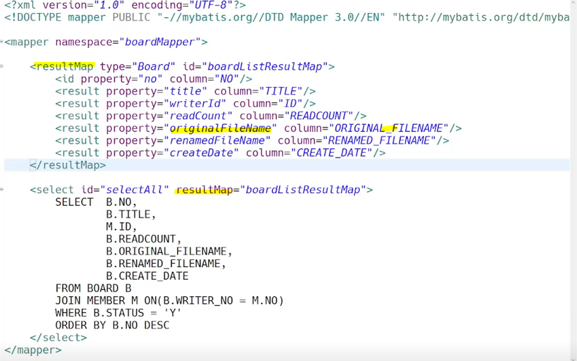 5) resultMap : 조회되는 결과를 Board 클래스 필드명에 셋팅한다.